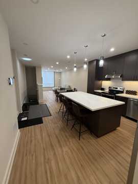 Brand-new, never lived in dorm-style complex with private 4 bedrooms with natural light. Bedrooms are locked and separate keys provided to each tenant for their respective bedroom. Fob provided for front door. Two separate lounge areas with TVs and furnished. Wi-fi is included (no TV package but can be discussed).Total of 5 bathrooms divided in 3 powder rooms, and 2 shower rooms with sinks. Bedrooms are furnished ready to move-in (bed frame,new mattress (double), side table, desk and chair), and closet in each bedroom. There is a separate storage room which can be utilized for bike storage as needed, or additional storage space. Brand new large kitchen with 2 fridges, 30" stove with hood fan,dishwasher, microwave, and most utensils, dishes, and kitchen supplies generally needed. Plenty of storage in kitchen for all needs. Kitchen includes a large entertaining island with 3 counter stools. Dinner table with 4 chairs provided. Cleaning personnel will be looking after all shared common areas every 3-4 weeks as needed. Cleaning services are not included for private bedrooms.