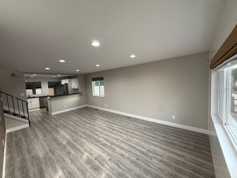 The main level features a bright living room that flows into the dining area and updated kitchen with white cabinetry, granite countertops, and stainless-steel appliances. New laminate flooring and abundant natural light create a warm, inviting feel throughout. Upstairs you’ll find the primary bedroom, an additional bedroom, and a nicely finished full bathroom.