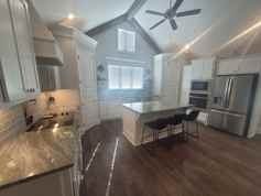 The kitchen serves as a true centerpiece of the home, offering tile flooring, stainless steel appliances—including a stove, refrigerator, dishwasher, and microwave—and an impressive amount of counter and cabinet space. A large island with bar-top seating anchors the room, complemented by granite countertops, a tile backsplash, and a convenient pot filler. Vaulted ceilings with exposed beams, recessed lighting, and a ceiling fan add architectural interest, while a large window over the sink fills the space with natural light. Two pantries provide excellent storage, and the kitchen opens seamlessly to the dining area, making it ideal for gatherings and everyday meals alike.