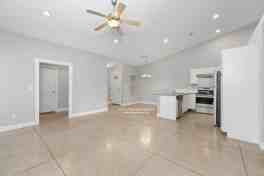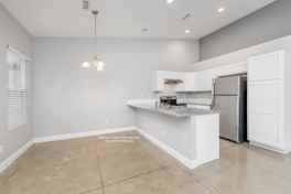 This zero-entry ground-floor-only townhome has concrete flooring throughout. The kitchen features granite countertops and newer stainless-steel appliances, including a refrigerator, stove, and dishwasher. There is a separate laundry room with hookups available for a washer and dryer. A full bathroom is located off the hallway. The main bedroom includes a walk-in closet and a full en-suite bathroom.