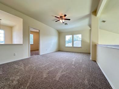 LAWN CARE INCLUDED. beautiful 4 BR in conveniently located neighborhood. You'll enjoy coming home to your welcoming front patio with space for your favorite chair and be greeted with a open floorplan and high ceilings. Enjoy big windows and gas fireplace in the living room with cathedral ceilings and open flow to the kitchen. Plenty of cabinetry, walk-in pantry, counter-space. Separate formal dining. Primary bedroom downstairs with beautiful natural light. Bath has double sinks, separate shower/soaking tub and oversized walk in closet. 3 bedrooms upstairs, all spacious with ceiling fans, high ceilings. So many options for the game room! There is space for game tables, sofas and entertainment! Fresh paint, brand new carpet throughout! In house laundry, half bath, 2 garage remotes. Back yard fenced with concrete sitting area. Sprinklered yard! Short drives to schools, dining, shopping and movie theatre. Easy commutes to I-45, Lake Conroe, Grand Parkway 99, Hardy Toll Road, Huntsville.