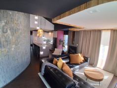 Highlights include a sun filled living room with patio doors to wrap around deck, large L-shaped leather couch, large built-in TV, sculptural lighting, and new electric fireplace with heat feature. The open concept euro-kitchen has beautiful appliances including side by side frig with ice/water hookup, dishwasher, oven, microwave and quartz counters.