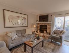 The living room centers around a stone fireplace and opens to a private balcony, ideal for fresh air or quiet downtime.
