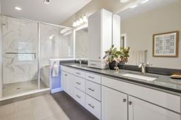 The main level features soaring ceilings, an open concept floor plan, and a designer kitchen with a large island, perfect for cooking, hosting, or enjoying everyday meals. The living room centers around a cozy gas fireplace and opens to a private outdoor patio through oversized sliding doors, powder room and convenient mudroom complete the first floor.