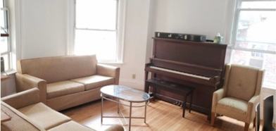 The apartment features wood floors, central heating, an en-suite bathroom, LARGE rooms, a yard, a large deck, and two living room areas.