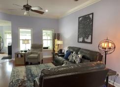 Inside, the living room serves as a welcoming central space with durable LVP flooring, recessed can lighting, and a ceiling fan, creating a bright and comfortable atmosphere that flows seamlessly into the main living areas. The kitchen is thoughtfully designed with tile flooring, stainless steel appliances including a stove, refrigerator, dishwasher, and microwave, and an abundance of cabinetry and counter space. Granite countertops and a kitchen peninsula with bar-top seating make the space both functional and inviting, while recessed lighting and a window over the sink allow natural light to enhance the open connection to the dining area.