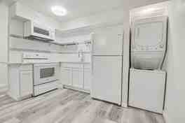 The kitchen offers white cabinetry, white appliances, and granite countertops, creating a clean and modern look. Kitchen is open to the living are for a seamless flow. A stacked washer and dryer are conveniently located in the unit. The sofa and entertainment center are included, making this home truly move in ready.