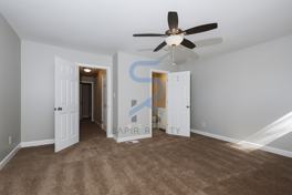 The modern L-shaped kitchen boasts crisp white base and wall cabinets, offering plenty of storage and a clean, contemporary style that’s perfect for any home chef. Each bedroom is designed for ultimate comfort with ceiling fans and ample storage — including a walk-in closet and his-and-her closets for effortless organization.