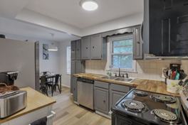 Stylish renovated kitchen featuring new cabinetry, countertops, and appliances