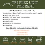 2/1 unit available with a garage. Washer, dryer, fridge included. The School District falls within the Redlands Unified School District. Please email, text or call for more details.