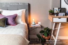 Rents start at $750/month and go up to $900/month (plus $60 flat fee per occupant for utilities). Most units come with full-size beds, mattresses, dresser, desk, and chair.