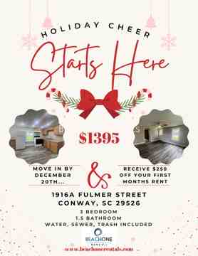 Don't miss out on this refreshed, 3 bedroom, 1.5 bathroom first floor apartment near Downtown Conway! This unit offers comfort, convenience and modern finishes throughout. Step inside to find luxury vinyl plank flooring and fresh paint in every room, creating a bright and welcoming space. The large main living area provides plenty of room for relaxing or entertaining, while ceiling fans in every room help keep the space comfortable year-round. The full bathroom features a tiled shower, adding a touch of style and durability. Enjoy the convenience of full-size washer/dryer hookups, making laundry days easy and efficient. With spacious bedrooms and thoughtful updates, this home offers everything you need for comfortable living. Water, sewer, trash and landscaping included. Tenant responsible for electric and renter's insurance. Sorry, no pets allowed. Annual lease required. Resident Benefits Package (RBP) Available!
