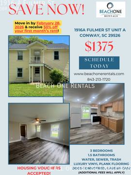 Don't miss out on this refreshed, 3 bedroom, 1.5 bathroom first floor apartment near Downtown Conway! This unit offers comfort, convenience and modern finishes throughout. Step inside to find luxury vinyl plank flooring and fresh paint in every room, creating a bright and welcoming space. The large main living area provides plenty of room for relaxing or entertaining, while ceiling fans in every room help keep the space comfortable year-round. The full bathroom features a tiled shower, adding a touch of style and durability. Enjoy the convenience of full-size washer/dryer hookups, making laundry days easy and efficient. With spacious bedrooms and thoughtful updates, this home offers everything you need for comfortable living. Water, sewer, trash and landscaping included. Tenant responsible for electric and renter's insurance. Dogs considered on a case by case basis. Additional fees will apply. Annual lease required. Resident Benefits Package (RBP) Available!