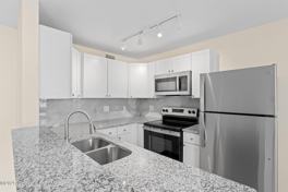 This two bedroom, one bath apartment is on the first floor of a well kept two story building. The layout works well! The living room has plenty of room to spread out, and the breakfast nook / dining area are right off the kitchen. That space gets great light and can be used for meals, studying or working from home. The kitchen was recently updated with new cabinets, granite countertops and stainless steel appliances. The bathroom was updated too with some new cabinetry and fixtures. There is a utility room with washer and dryer hookups, tile floors throughout the unit, sliding glass doors that lead to a small open air patio space and plenty of open off-street parking. This is available now! Move in before the holidays and enjoy kicking off the new year in your own place.