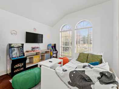 The property features spacious living areas, a fully equipped kitchen, Smart TVs, dedicated workspaces, in-unit laundry, and a 2-car garage. Entertainment options include basketball, arcade games, and board games, providing quality of life for extended stays.