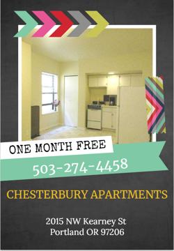 Located in popular NW Portland, The Chesterbury has all the charm you would expect of a vintage apartment building. Close to the streetcar and bus lines, supermarkets, and numerous shops and restaurants, our location couldn't be any more convenient. Our apartment homes feature built-in touches, spacious bedroom closets, large windows and voluminous balconies. Laundry facilities are on-site. Chesterbury Apartments is two blocks from the Portland Streetcar and close to the MAX, bus lines and several supermarkets including Trader Joe's, Fred Meyer, Safeway, Whole Foods and New Seasons.