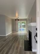 The interior features neutral paint tones, updated flooring throughout, and abundant natural light. The living and dining areas feel open and inviting, with a cozy fireplace as a focal point. Large windows and sliding glass doors connect the living space to the backyard, creating an easy transition for everyday living or entertaining.
