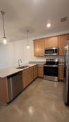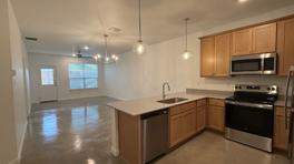 This never-lived-in home features an open-concept layout with polished concrete floors, recessed lighting, and abundant natural light. The kitchen includes quartz countertops, modern cabinetry, a large island with pendant lighting, and brand-new stainless steel appliances, making it ideal for both daily living and entertaining.