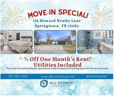 Welcome to this charming, partially furnished studio-style apartment in Springtown! The space comes complete with a microwave and mini refrigerator, and all furniture shown is included in the rent for your convenience. Residents will have access to a shared bathroom.