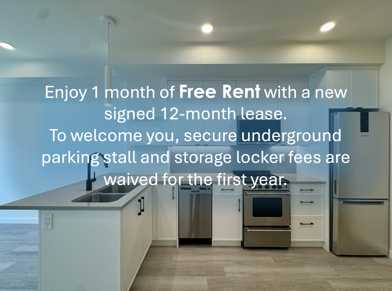 Move-in Incentive: Sign a 12-month lease and receive one month of rent free. To welcome you, all fees for a secure underground parking stall and storage locker are also waived for the first year. Total value $3,300.