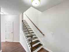 6 Ashborne Lane offers a modern, light-filled layout designed for both comfort and functionality. The open-concept main level features a spacious living area centered around a large kitchen island, perfect for entertaining or everyday living. The main bedroom is conveniently located on the first floor, providing privacy and ease of access. Upstairs, an open space at the top of the steps offers flexibility for a second living area, office, or play space. This home includes a two-car garage, washer and dryer, and is filled with abundant natural light throughout, highlighting its contemporary finishes and airy design.