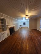 Step inside to a welcoming living room where wood flooring runs throughout, highlighted by custom built-ins, a cozy fireplace, and a ceiling fan for year-round comfort. The kitchen is both stylish and functional, featuring stainless steel appliances—including a range, refrigerator, and dishwasher—along with plentiful cabinet storage, expansive counters, and a window above the sink that fills the space with natural light.