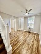 On the First Floor you have a lovely dining room/ kitchen with ceramic tile floor, white wood cabinets, ample granite counter tops/ breakfast bar, glass backsplash, stainless steel appliances, new dishwasher, glass cooktop, large under stairs storage. First floor also has an updated hall, full bathroom, one bedroom with a laminate floor that can be used as Den/Study, Living room with beautiful laminate floor, new lighting and ceiling fans.