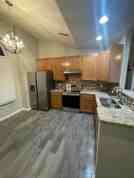 The spacious kitchen includes a tile backsplash and comes fully equipped with all appliances, including a washer and dryer.