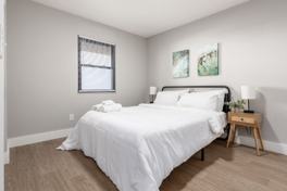 The bedroom includes a comfortable queen-size bed and a closet with ample storage. The bathroom features a tub and shower combination. A washer and dryer are conveniently located on the first floor of the building.
