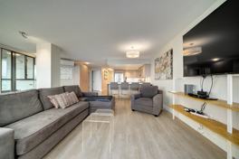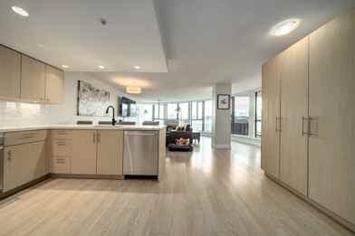 The kitchen has been fully opened up and extended to create a large work area unique to entertaining. It features, Stainless appliances, quartz counters, undermount sink, task lighting and breakfast bar area. The Living space is comprised of a unique sphere shape window and large open area allowing for various furniture layouts including Living room, Dining areas and a space to create your office/den. The windows are wall to wall and floor to ceiling providing an everchanging city and water scape. You will also be able to enjoy sunsets over the Burrard inlet. Both bedrooms are spacious and will accommodate King size beds and other items of furniture. This property is unfurnished and includes; hot water, gas, and 2 parking spaces plus EV charging station available in the building. In addition, a dog is allowed on approval. Showings are by appointment.
