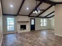 The living room features vaulted ceilings with exposed beams and a painted brick fireplace, making it a cozy yet open space to relax or entertain. The dining area flows seamlessly from the living room and kitchen, offering great flexibility for everyday living.