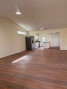 The open-plan living area is the heart of the home, featuring a brand new, stunning kitchen. It boasts custom-made cabinets, a solid surface countertop, and a functional center island, perfect for cooking and gathering.