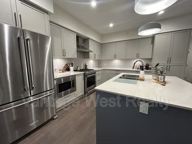 -Designer kitchen with quartz countertops, large island with seating & under-cabinet lighting