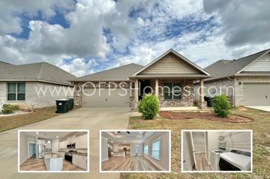 AVAILABLE NOW! Welcome to this inviting 4-bedroom, 2-bath brick home in the desirable Stagecoach Subdivision. Offering 1,815 sq ft, the open-concept layout seamlessly connects the living, dining, and kitchen areas. It's perfect for everyday living and entertaining. Enjoy low-maintenance luxury vinyl flooring throughout, a bright kitchen with granite countertops and stainless steel appliances, and a spacious front porch for relaxing outdoors. The fully fenced backyard provides privacy for gatherings or pets. Additional features include gutters and blinds throughout. Conveniently located just 22 minutes from downtown Pensacola and 31 minutes from Pensacola Beach. Washer/dryer included. NO smoking. 600 minimum FICO credit score required in addition to meeting rental criteria. Pets allowed upon approval with a non-refundable pet fee and with a pet screening report.