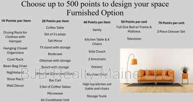 Does not come furniture shown, photos of a similar unit, see furniture list in photos to set up your unit!