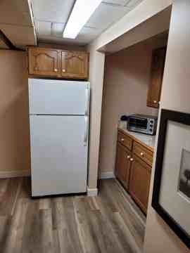 The rent includes 1 bedroom, 1 private half bathroom, and a bright and private living/den, on one basement floor. Then there is a private kitchenette and stand-up shower on the second level of the basement. With a kitchenette with a full fridge/freezer, microwave, conventional oven, burner plate, and full counter and cupboards. The laundry facilities with washer/dryer (shared) the upstairs It has a large window in the living room to let the sun in. The bedroom is quite big and has a nice-sized closet. Street parking in front of the house. Share with the front door: working on making the door private.