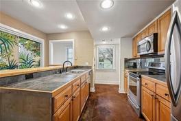 A stained wood stairway leads to the first level of the condo, which features stained, scorched concrete flooring throughout the living area. The open floor plan combines the living, dining, and kitchen spaces. The kitchen includes stainless steel appliances, tile countertops, beautiful custom cabinets, and a wood block breakfast bar. There is also a convenient half bath for guests. A new coat of stain and wax was put on flooring. New sprinkler heads are being installed. New faucet in kitchen and master bath.