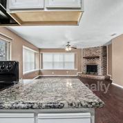 Welcome Home! This 3-bed, 2-bath home features wood-look floors in living areas and cozy carpeted bedrooms. The open floorplan offers a spacious living area with a corner brick fireplace and large windows. Kitchen features granite counters, white cabinets and an all-black appliance package: electric stove range, microwave, and dishwasher. Enjoy the fenced back area with personalized driveway that leads into the private garage. Washer/Dryer hookups included! Convenient location, plenty of charm, and move-in ready!