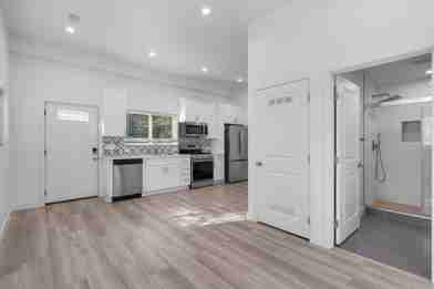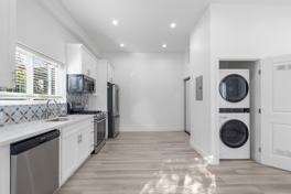 Modern studio with a private entrance and its own mailing address. The unit features a contemporary kitchen equipped with a gas stove, stainless steel refrigerator, microwave, dishwasher, and tile backsplash. A stackable washer and dryer are located inside the unit for convenience. The bathroom includes a walk-in shower with a rain showerhead. The studio has a wall-mounted unit providing both heating and air conditioning. A small private outdoor garden area is included. One gated parking space is provided. Well maintained and located in Valley Village, close to shopping, dining, and major access routes.