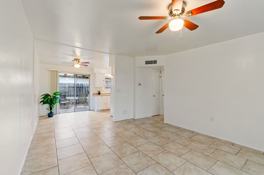 900 sq ft, A/C. Brand new tile flooring throughout, freshly painted interior, new tiled tub/shower surround, many brand new updates underway. New photos to be posted shortly once updates are complete. Cottage kitchen has an electric stove, full size refrigerator. Laundry hookups on patio. Great light with skylight in bathroom and SW facing sliding glass door that opens out to patio. Private shaded patio in back yard is surrounded by mesquite trees. One dedicated parking space under a covered carport plus off-street parking.