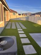 Step outside to a low-maintenance backyard featuring artificial turf landscaping, a patio, a cement tile pathway, and a concrete pad perfect for a gazebo or fire pit—ideal for entertaining or relaxing.