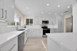 This home is a true 10++! Superb location and loaded with charm, featuring stunning tongue-and-groove vaulted wood ceilings in both the living and family rooms. Completely remodeled with impact doors and windows plus accordion shutters, beautiful wood-look flooring throughout, and a gorgeous kitchen with quartz countertops and stainless-steel appliances. Enjoy a formal living room with picture windows, dining room, and family room, along with convenient counter seating in the kitchen. Excellent split floor plan offers a private primary suite in the back, two bedrooms and a full bath up front, and a separate den/library with laundry room on the opposite side. Large gated yard with ample space for a boat, RV, and multiple vehicles. Not in a flood zone.