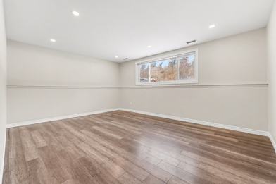 Move-in ready 2-bedroom, 1-bath lower level unit at 392 Tremblay Rd, featuring large windows, a functional layout, and a bright, refreshed interior with modern finishes and upgraded lighting.