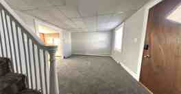 This two-story residence in Upper Darby, PA, offers a blend of vintage charm and practical living space. The home features two bedrooms and includes a kitchen with wooden cabinetry, patterned upper cabinet doors, and a granite countertop. White appliances and tiled flooring complete the kitchen's functional design. Wood paneling and drop ceilings are prominent features throughout, adding a retro aesthetic. The upper floor houses bedrooms with carpeted floors and wood-paneled accent walls. Windows in various rooms provide natural light, while baseboard heating ensures comfort. The property's compact layout, including a hallway and staircase, maximizes the use of available space. Despite its modest size, the home offers distinct living areas and maintains a cozy, lived-in atmosphere, ideal for those seeking a manageable living space with character.