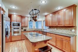 The sun-filled kitchen opens to a spacious entertainment room and extends outdoors to a large deck, perfect for BBQs, gatherings, and relaxing with friends.