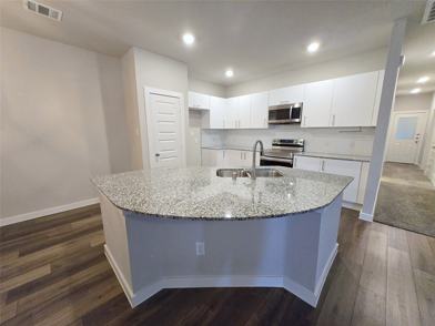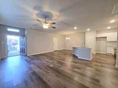 This beautifully maintained one-story home offers a spacious open floor plan with soaring ceilings and faux wood flooring throughout the living, dining, kitchen, and bathroom areas. The island kitchen features sleek granite countertops, a stylish tile backsplash, designer lighting and fixtures, and stainless steel appliances. The primary bedroom boasts an en-suite bathroom and a generous walk-in closet. Enjoy a private, fenced backyard with a covered patio, perfect for relaxation or entertaining. The front yard is maintained by the HOA for added convenience.