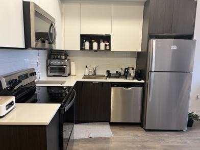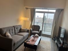 Occupancy for the 700-sqft 1-bedroom + den, 1-bathroom condo unit. Den can be used as a 2nd bedroom. Central heating and AC. 1 parking spot & 1 locker included. Included appliances: fridge, stove, dishwasher, microwave, washer, dryer, and range hood. Building amenities include: fitness facility, yoga room, concierge, party room, elevator, BBQ, bike storage, visitors parking, garden and more.