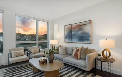 Step into sleek city living in this modern 2-bedroom, 2-bath corner condo (1,185 sq. ft. per MLS) with floor-to-ceiling windows framing sweeping San Francisco skyline views. Built in 2014, this light-drenched home features an open floor plan, wood floors, and a stylish kitchen with gas stovetop perfect for entertaining or quiet nights in. The primary suite offers a walk-in closet and en-suite bath, while the second bedroom is ideal for guests or a home office. Lifestyle perks abound: 1-car garage parking, solar-friendly building, and luxury amenities including a rooftop deck with panoramic views, interior courtyard, and bike storage. With onsite security and attended lobby, convenience meets peace of mind. Boasting a near-perfect Walk Score (98), Transit Score (100), and Bike Score (83), this location places you steps from Whole Foods, Safeway, parks, and some of the city's best dining and culture. This is San Francisco living at its most vibrant.