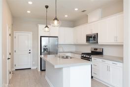 The kitchen opens to the main living area and includes generous cabinet and counter space, a reverse osmosis water system (with supply to the refrigerator), and the pendant lights above the quartz kitchen counter adds a modern finish. The home also includes a whole-house water softener in the garage.