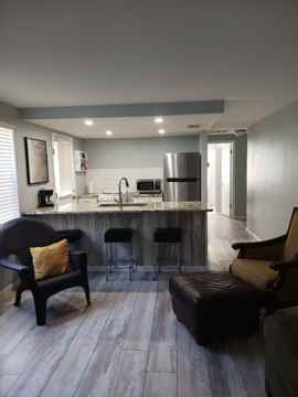 Beautiful apartment located next to the New Port Richey Recreation Center in downtown New Port Richey. Fully furnished all utilities Included. Water. Sewer. Trash. High speed internet. Cable. Set up hotel style with 2 double beds in large living room with small couch,chair,tv. Large bar between living room and kitchen. King size bed in bedroom. 1 bath. Private entrance and parking. Typical small town sounds in neighborhood.